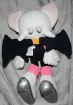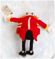 Here's a better look at the X plush set's Eggman. He looks fine from the back, they kept the detail of his coat & the 'fins' at the bottom are floppy as they should be. The detail shot at right shows his cuff, both sides of the cloth tag (so you can see authenticity) his shoe color decals & the details for his face. The goggles are 3D with little colored dots for the 'glass' his eyebrow ridge is sewn on & the mustache is flat felt. This is a good & detailed plush.