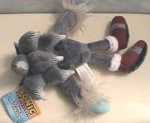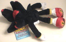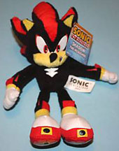 Here are Jazwares first 3 efforts at Sonic plush making. Their first run has Sonic, Shadow, and Werehog all at 7 inch scale. Each one is made of fuzzy fabric and has embroidered edges to their eyes. Shoe details such as Shadow's glide-emitter holes and Werehog's 'spikes' are drawn on. With all 3 dolls, details were not neglected, such as Shadow's glove/sock cuffs, Werehog fangs, Sonic Shoe buckles and the dingyness of the Werehog's shoes.