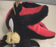 With these back photos, you can see the werehog uses fabric-paint (semi glossy) to make the different color at the ends of his spikes. Shadow/Werehog tail and back spikes are flat pieces of the body fabric. Side view is provided of his head as it shows that...it does leave some to be desired. The 'feel' of all of these plushes is very soft. The fabric has many tiny silky hairs, and is the same on all 3. If only their faces were better, this would be a solid little plush line, as they're construction and fabric variety is good. The price isn't so hot, at nearly 10 dollars (with tax) for such little things that don't have the best design going for them.