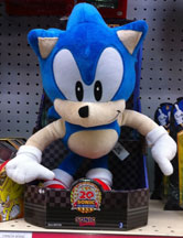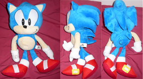 Larger still, is this 15 inch classic style Jazwares Sonic plush. He's their biggest yet, and seems well constructed. Notice the 'thumbs up' and 1 pointing finger hand pose. Should be between $18 and $24.99 at Toys R Us. He is sold inside a small cardboard 'chair' like open top item. He's strapped in there to be sort of 'sitting'.
