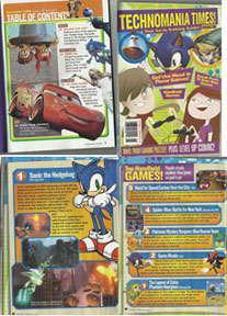This is an issue of Disney Adventures magazine from November 2006. It has Sonic on the cover (main feature CARS) & some Sonic content inside too, which you can see at right. The page with Lightening McQueen on it tells you that they'll talk about Sonic's newest game, with Silver & Shadow in it. The Technomania Times tells you a little about Sonic 06, and the full page has screen shots from it & the text has a little of the plot. The "Games!" page section there has Sonic &Shadow from the PSP game Sonic Rivals and has a mini blurb about how you can race your friends. It's interesting to see so much Sonic coverage in a dedicated Disney magazine here.