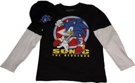 Here are 3 different shirts found in Canada Wal Marts. You'll easily recognize the first one with rectangle character close-up portraits as a variant of the USA version of this same design. The difference here is, that the tee is navy blue. The 2nd is a long sleeve shirt & cap combo item. The shirt has a nice new design, with Sonic in front of a big red star-bumper like shape. The cap (interestingly enough) has the SonicTeam Sonic face all-blue logo embroidered on. There are rows of little yellow & red stars beside it. The third shirt has backward leap/tumbling Sonic in front of a ring of stars that has the "SA" type swirl in the middle. Each ones is a boys/teens size.