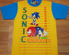 The 'die cut tag' people are at it again, with their bright Sonic shirts in variant colors. These two have a Sonic & Knuckles & striped theme. The Sonic is likely to be a plastic piece. Their names are written various ways all over the shirts and in the 'title tag' like one, curiously Knuckles gets first billing. Again with the kid sizes, but they do go fairly big. Choose your fave color in 2010!