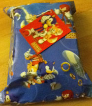 Finally, Sonic wrapping paper! This is likely to be the FIRST Sonic themed gift wrap to ever appear. It's nicely modern with a variety of CG Sonic, Tails, Knuckles, Rings and even Dr. Eggman! This package has 3 sheets of folded gift wrap, & 2 matching gift tags. It costs about 1.99 pound, and can be found at Toys R Us stores in England around the fall of 2011.