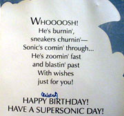 If you are the one having the birthday, it would be great to recieve a Sonic the Hedgehog birthday card. This is a large card, about 8 inches high. The background is an odd hot-pink, and although you can't tell in the photo, the cloud has iridescent glitter all over it. Naturally, the inside has one of those wacky rhymes common to B-Day Cards.
