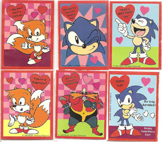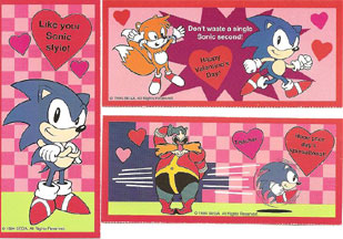 In the gallary are the valentines from inside the checkered pack. (clearly, as they are mostly checkered too) As you might expect, they're a bunch of stock arts with hearts and various pink themes thrown around. Sonic is not a particularly flowery character (and neither is Batman...but yet he's made it onto valentines as well I'm sure) Still, these are a rather quaint collectible, if you can find them.