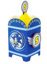 Set the table up right with this Sonic centerpiece! It's a 3D fold out square. The interior has that webbed / fan-fold tissue paper (yellow) so that it'll keep its shape. The sides even have pop-out "S" symbols with wings on the sides. Another "S" symbol in a ring tops the whole thing off. A newer Sonic stock art is used in a swirl on the sides, and rings & checkers adorn the edges. This is a nice & well thought-out Sonic centerpiece. (rather classy too, as these things go)