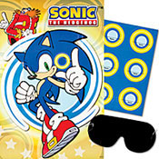 This game gives the old party staple "Pin the tail on the donkey" a Sonic theme. The game is a poster (about 24 inches) with a picture of Sonic who has 1 finger raised. It comes with ring stickers (that can be peeled off) and blindfolds (paper, black) so the objective is to see who can get their ring sticker closest to the finger, to win. Notice there's pointing Eggman in the background...if you stick it to him, do you lose? After the game is done, it's still a cool poster for you to have! It is only about 4.00.