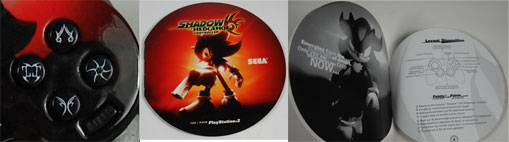 They made a special controller for the game Shadow the Hedgehog on the Playstation 2. Everything was themed just for Shadow! It came in its own special plastic dome case, that you can see here. When you take off the dome, you'll find the red & black controler (it's smaller than a normal one) & Sega branded cord. The bottom of the 'box' has more Shadow imagry and logos. There's a glossy coating with Shadow portrait on the upper half of it & look, even the buttons are themed with the sort of tribal style symbols. (the start button is also in an odd spot) The instruction manual is round (appropriate) & features more art in color & black and white while explaining the buttons. It uses quotes from the game box & manual like how you decide what path to take in the game & etc. The controller was known for a defect though: either all or several of them could not use the "Click the Stick" on either thumb-stick command. The sticks would still click/make noise/act like you were pressing correctly, but if you had a game that required doing that, it wouldn't work. This item is in the SonicGear personal collection.