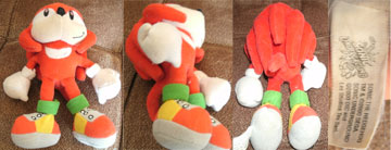 In the gallary is the Denny's Knuckles plush from page 1, but here you can see him better because he's out of the packaging. For a promo doll, he's pretty decent. The shoes only have 4 bolts instead of 6, the fists are kind of small...but that seems to be about it. The face and spikes look all right as well. Notice the "Sonic Underground" labeling on the tag there. Knuckles DID appear in the show, for only 2 episodes.