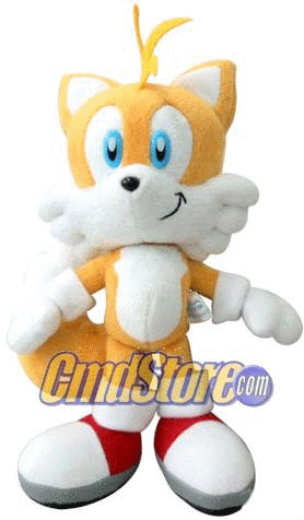 This Tails is from the same set as the above Knuckles plush. He has a few details (not mistakes) that make him unique. First off, the 'points' at the edge of his chest are not 3D or felt, like most others. They're represented by wavy-ness in the cut of the cloth. He has felt bangs, and a nice triangle plastic nose. Again, at the sides of his head they bothered to do actual stuffed-texture rather than use felt which gives his head more of a 3D quality. They did neglect his bands on the cuffs of his gloves, but it's not a really awful error. Compared to most USA Tails plushes, this one is really quite nice. It's fairly cute and well proportioned, even on the face.