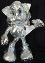 This is a rather strange plush. It's a Sonic...but made of all silver-tone shiny cloth. Much like the pure white Sonic & Tails from Japan, he retains none of his original color, not even for the eyes which are now just black and gray. You can see that he is official, due to the side tags and the Toy Network tag on his foot (right). While it IS interesting to see, he's still not quite on-model with his rather tall head and sideways ears. However, he's not as bad-off as many of their other dolls. This can be won at certain arcades in the USA. .