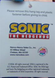 There's a new name on the plush making scene for late 2012, and that's "Nanco Nancy Sales Co". They appear to be a maker of licensed Sonic plushes in various sizes. They are most likely a "prize toy / fair toy" manufacturer, sort of like how Kellytoy started out. These 3 sizes of Sonics were spotted for sale at a vendor booth at the Fresno Fair. You can see the front of the tag in the photo, & the back at the right. These will likely show up as prizes on fairgrounds & amusements elsewhere. BEWARE: vendors sometimes pair official things with fake merchandise, especially at 'anything goes' venues where these may show up. There's an entry on Bootlegs with this same company's dolls.