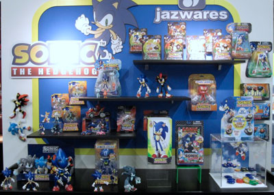 This is Jazwares' Display Booth for Toyfair 2011. You can see at the bottom their selection of already-released/current figures including plushes, 10 inch Metal Sonic, Racers & single-card figures. Super Posers join the bunch, and they seem to have tacked some dolls to the wall (??) Most everything else seems to be just a mock-up of empty package+art. It looks like some kind of large modern Sonic will appear (why? They've already done 10 inch Sonic) A Sonic & Amy classic 2 pack, some of the 3 packs (Seen above at the UK show) and mysterious colored disks (bottom right) 2011 is def. shaping up to be an interesting year in Sonic figures.