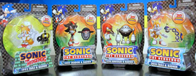 At the first toyfair of 2011 (in the USA) Jazwares shows off their plans for the Sonic 20th Anniversary Celebration. Notice that each box has the 20th sticker on it, & has a checkered theme. Note that these are just Mock-Ups. There are NO figures in these boxes, it's just Sega art pasted into the packaging as a stand-in to show what they want to do. They're all also just labeled "__& Badnick" even though the badnicks were named in the game. Classic figures are paired with classic enemies, & the same for the modern ones.