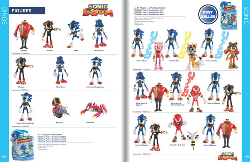 These pages are all about the regular size (3 inch) figures. It confirms Shadow & Metal Sonic with actual photos of the figures. It's nice to see the addition of some badniks too, you can spot the modified Motobug, Eggman's new crab, and "Beebot" down there with Knuckles. It also shows that the 'altered' figures like "war paint Sticks" will be 2 packs with another altered figure like "Oily Tails" and Dirt Sonic / Bruise Knuckles. Notice the "Best seller" sticker here, showing that these small line figures are doing well.