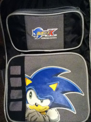 Here are 2 Sonic school supplies. At left is a soft-sides insulated lunch bag, & at right is a rolling backpack. They both have a Sonic X theme, & seem to be good quality plastic/canvas. The 3 lines on the side are for name/ personalization in case it gets lost.