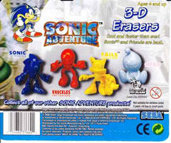 Here is a nice look at these uncommon erasers! These are figural erasers produced by Toy Island, and released around the time of Sonic Adventure 1. However, they were difficult to find, even when new. They were advertised on the box-backs of other items, so you may have seen the photo before. Each eraser is a mini fully sculpted figure and you get Sonic Tails Knuckles & a Chao. The features are cut-in (hard to see in photo) and each one is a solid color. Note that the actual erasers are much less shiny than the ones in the box-back scene.