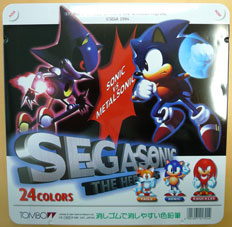 All 3 of these are colored pencil sets inside of metal tins. Each was made by Tombo, and has 24 different colors inside. The corners all say 'press' (either in English or Japanese,depending which tin) The first 2 look very SA style, and were likely released soon after the game. For some reason the 2nd one features that skateboard he never manages to use, as well as Tails, Amy & Knuckles portraits. The left one is older and matches with several school supplies (See sharpener above, even) that had the whole "Sonic vs Metal Sonic" theme going on. The art for Metal is fantastic on anything with this theme, but the size of the tin really shows it off here. Look at the fun pose for Sonic & Tails at the bottom...they're both super classic & cute.