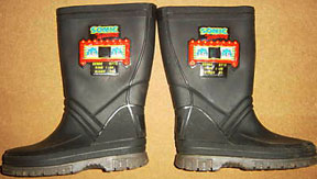 These are solid rubber rain boots, called Wellington Boots. Usually boots are such a plain thing, but the S&K symbol can make anything stylish! It's nice and big on the side of each one, with the name too, all done in shiny plastic. These are uncommon.