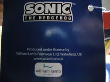 This is a pair of kids wellington boots. They're an all-rubber rain boot with cool Sonic theme. It uses new 2011 Sonic art nice & big on the sides, with the modern logo. The tag has the license info & that it was made by William Lamb Footwear. You can get these in fall 2011 at Sainsbury's for about 9 pounds, however, do watch out because they're all small. Look at the pair sitting on the hand, that's not likely to fit anyone which is too bad.