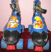 This is a seldom seen pair of Sonic rollerskates! For some reason, like the skateboard, these are super rare. They were made somewhere in the UK, and have a "Hedgehog with Attitude" slogan on the side. The tops are the familiar checkering, and the velcro band to keep it on is decorated with Sonic's name and some sihlouettes of running Sonic.