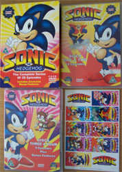 The convenience continues with this box set. As announced on the cover you see here it has "the complete series of 26 episodes" of the SatAm Sonic show. The cover doesn't particularly use anything directly from the show except for the logo/title piece & the rays in the bkgrd. The Sonic isn't a stock art, & you'll notice that he (wrongly) only has 4 fingers (plus odd slipper-ish shoes, oddly titlted body & spikes. This box set also includes stickers. The ones you'll find in here are 4 Sonics, all in different styles, 1 tails in SatAm style, 1 correct Robotnik and 2 SatAm logos. Since this series was shorter, it was always more likely to be in just one box, but it's great to see that it is still for sale in 2010. You can get it on AmazonUK for around 17.99 pound, & it too has been available since around 2008. Info provided by RedX.