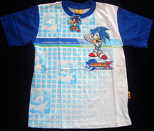 Another decal gets applied with this shirt. It's the same "puffy-sticker" type solid plastice piece set on as an applique of sorts. (the logo is not a part of it) This has a fading grid of light blue (or yellow) squares with various Arm-Cross-Point Sonic X stock art portraits scattered among them. On the fading stripe is the usual "Rose Video" line and copyright information. Blue or red accents top off the design.
