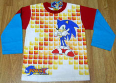 It is interesting to see such directly opposite colors creating a varient shirt. The Sonic is printed on, and is standing infront of gradient shaded rounded boxes, forming a large 'pixel' "X" for Sonic X. The logo of course, is in the corner, as they generally like for this to be pretty big among the designs.
