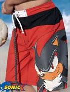 Here are two cool bathing suits for boys. The blue Sonic one is accented with red at the top and gives Sonic a bit of a red border too. It uses the same concept as the above shirt run/behind Sonic done quite large so that he almost becomes a design. Both use elastic wasit with drawstring top. The shadow shorts may be slightly confusing at a distance as his red stripe blends into the color of the material quite easily. Still, they chose a good art for him and the suit is stylish. It should also be noted that girls can wear these too, as regular shorts in most cases if they still fit. Both of these are 14 pounds each.
