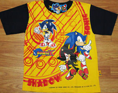 This wheel-like design/background shirt could be found in winter 2009. Available in 2 styles seen here, and mostly in kids' sizes, it's by the die-cut tag company again. This shirt uses plastic-coated Sonic, along with some dynamic new Sonic X art for Sonic & Shadow. The cog/wheel like design adds interest to the background. With not over-used art, this shirt is cool.
