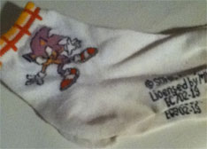 Here are 2 pairs of Sonic X socks. The first is new with the tag on it (see the little logo) as well as a small sticker. The blue theme is nice, with thumbs-up Sonic. The second pair (same pose as the above towel) has been worn...and washed...and so the blue dye on the threads for Sonic has faded to a strange color! Some dyes fade more easily than others, so keep in mind while washing & wearing.