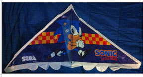 Here's a very rare item. This is a Sonic Kite. Why is it in sporting goods? You can only use it outside, and some types of kite flying are considered sport. This kite is in the "Delta" shape, and is 50 inches when you unfold it/put it together. It is tough plastic with light plastic rods to keep the shape. This was made in 1992, but apparently not that many were done, as this is one of the rare-er Sonic items. (possibly also due to its large size, people had difficulty storing it) If you can manage to collect this, you'll be one of only a few!