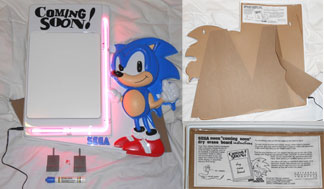 In the gallary you can see a better picture. This neon-bordered board was seen on Retail Display 1, but here's a closer look at it to complete the entry. It has a real light up neon tube in the plastic edge, & fins on the back so it could stand on a counter or fold flat to hang on the wall. The top says "Coming Soon!" & the store was meant to write the names & dates of games on the whiteboard with the enclosed marker. The card on the back there shows an illustration of how you're supposed to fold & use the board, and plug in the neon bit. The art of Sonic shows him with 5 fingers, so why the actual sign is wrong is still a mystery.