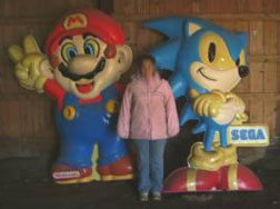 He's giant, because he was a part of a retail store display in the 1990s. (Thought to be Best Buy, write in if you can confirm this!) He's a relief figure (not fully 3D, but not flat) made of plastic. It's possible parts of him were hand painted. See how the color is uneven? He is likely discoloring with age. At right, you can see a Mario one was made in similar size/ format. They were likely displayed together by hanging on a wall in the store. There are likely only as many of these as there were stores at the time.