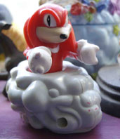 Knuckles is a simple rolling toy. When you push his cloud along, he twirls in the center. No one's sure why though, as he didn't really twirl in any of the games, but oh well, at least he works well.