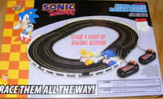 Well, in the winter of 2008 Impact Innovations got around to producing this racing set. It was shown as a prototype earlier, but this is the real set. As predicted, it is quite an ordinary race-track, with Sonic & Tails being the only 'Sonic-ish' things about it. The controllers (wired to the set) have a classic styled logo sticker on them. The box is fairly oldschool looking, with classic stock-art and the words "Super Sonic Racing System" and "Race them all the way!"