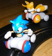 The figures themselves are pretty good, almost like little action figures with no feet/legs. Tails is especially nice, not drawing on the ugly stock art, but rather the cute Japanese style. Sonic has an off-model blue line under his eyes, but is otherwise quite reasonable. However...nearly everything else about this is UNreasonable. First, it could only be found at Debenhams (a department store in England) for perhaps a week before Christmas, after which they all sold out. However, that wasn't the worst of it, as it appears they all BARELY WORK. A fuzzy wire under the 'cars' connects them to the electricity running in the gooves of the track. It does not keep contact, and the cars stop. Both buttons do the same thing, and the cars often topple. Many are likely to be returned. The combination of "Rare" and "Doesn't work" plus a starting price of 12.00 pounds (about $24.00 USD) it a terrible one. The ones that didnt' sell apparently went on clearance--meaning it is not likely this will return to stores. * you can buy this in 2010 at Argos store online for about 9.97 pound. All info and photos (except prototype & argo)
