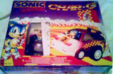 This is a remote control car that you can drive around on the floor. The style is somewhat 'dune-buggy' with a short little car that has a fin on the back. It's clearly a licensed-out item as the car itself is not very Sonic-like. He's a decal in the window so it looks like he's inside. The stock Sonic on the box has been modified to be holding the remote control (like a stick) for the car. This was available in Europe, likely in the mid 1990s. MIB Photo by Oni, loose