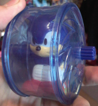 In the gallary is san actual fan photo of one. This is the Sonic rolling wheel. When you use the winder on the side, it makes the plastic Sonic inside spin around quickly, causing the clear wheel to go spinning along the floor. With this detail, you can see the 'spikes' texture on the side of the wheel, and get an idea of how big it is. Photo & owned by Shadouge. This was confirmed to be from France (though photo above was Finland...so it must have been all over Europe.)