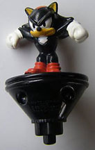 These two fighting tops came from McDonalds Happy Meals in France. You were likely supposed to spin them, and then see which top would knock over the other first. They were fairly creative with their 3D figures on the top, posing them in different ways, however their paint is not so good. Neither one's shoes have any detail, and Sonic's buckles are in the wrong place (directly under his ankles) These had to have come with launchers that would rev-up and release the tops. They're from 2006 and were used to promot Sonic X. Each one is 8cm high.