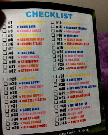 In the gallary you can see the clash cube cards, you got 2 with every pack, enough to build 2 cubes for yourself. You punch out the sides & snap together your custom cubes according to the rules. The check list above shows you there are 48 sides total, & names them all. The Sticks side acts as a wild-card in this game, but you can only use 1 per cube. You roll the cubes like dice to play it.