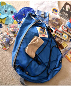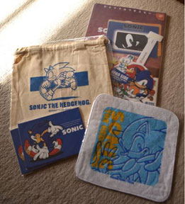 Here is quite a variety of Sonic items, some seen before, and others not. It seems to be centered around 10th Anniversary stuff. What can you spy here? The inflatable Chao arm hugger, inflatable Sonic face arm-strap, the 10th Anniversary tee, & a blue bag with elastic cord mesh on the exteriror. The bag has the 10th Logo tag, but no obvious Sonic branding/images. The 6 things in packages are the figureal SA1 "name base" keychains. There are 2 of the same metal pencil case with Sonic & Chao, a package of Puyos (non Sonic) strap farthest to the right is also non-Sonic. The two blue items in the lower left photo are post cards, there's also a canvas drawstring top bag, shelf wobbler (white STK flat piece) & that rounded edge piece of cloth that nobody still knows what it is.