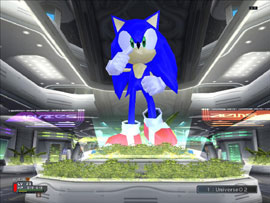 Here are some very large Sonic statues. These appear every Sonic's birthday in Clyez City. Where's that? It's on an orbital space station in the SonicTeam game Phantasy Star Universe. Anyone on Central Table can take a look at these huge figures! They're fully 3D and likely about 50-75+ ft high each! The Sonic in the middle is largest, and stands atop an empty fountain.